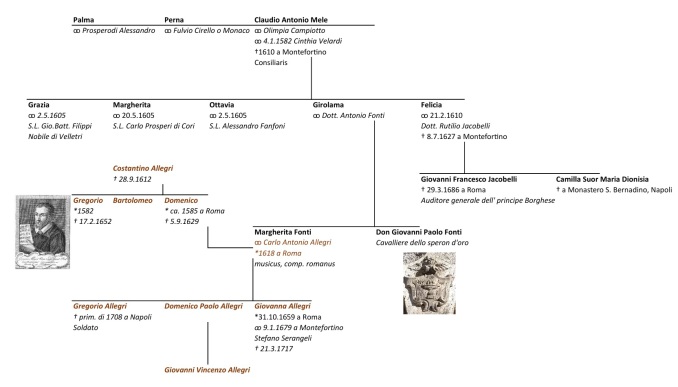 Dies sollte sich einstellen, denn Carlo Antonio Allegri heiratete in den 1650er Jahren die wohlhabende Enkeltochter des Montefortinischen Ratsherren und Klerikers Claudio Antonio Mele, Margherita Fonti. Die Familie Mele zählte Ende des 16. Jhds. zu den vermögendsten Familien Montefortinos: Claudio Mele pachtete für 12.000 scudi jährlich von Kardinal Odoardo Farnese die Abtei von Grottaferrata sowie deren Ländereien, er besaß Landwirtschaft und Weinberge sowie einen Palazzo. Aus Carlo Allegris Ehe mit Margherita Fonti gingen drei Kinder hervor: Gregorio (benannt nach seinem Großonkel), Cav. Domenico Paolo Allegri (benannt nach seinem Großvater) und - als Erbin Gregorios - Giovanna Allegri (*31.10.1659, Rom).